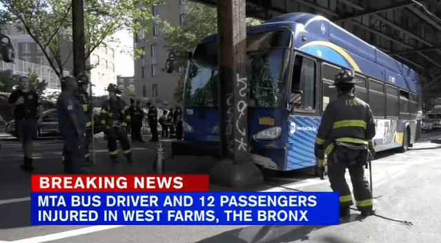 据abc7NY报道,周四(8月4日),早上8点30分左右,纽约市布朗士,波士顿路(Boston Road)和东特里蒙特大道(East Tremont Avenue)路口附近,一辆大都会运输署(MTA)公交车,意外撞上地铁高架下的一根柱子,致使公交车司机重伤,12名乘客受到轻伤。
